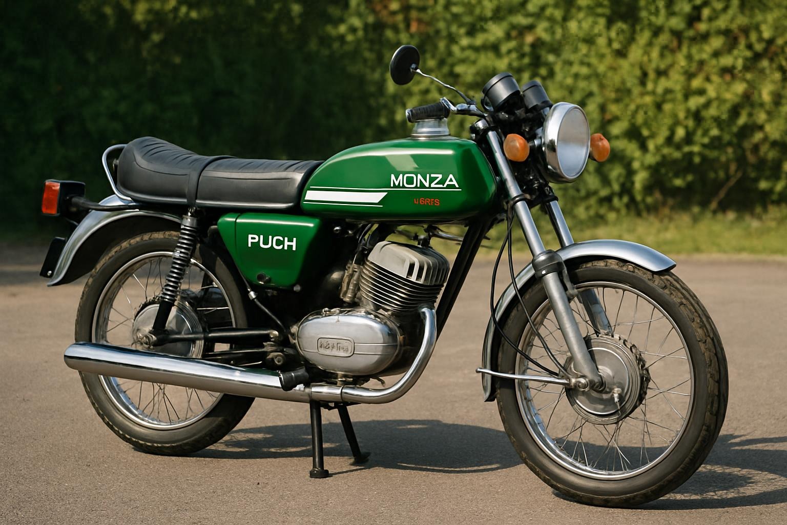 Die Puch Monza 4SL gilt als Symbol für die goldene Ära der sportlichen 50 ccm Mopeds. Ihr schlanker Tank, die markante Linienführung und der unverwechselbare Zweitakt-Sound machen sie bis heute zur Legende.